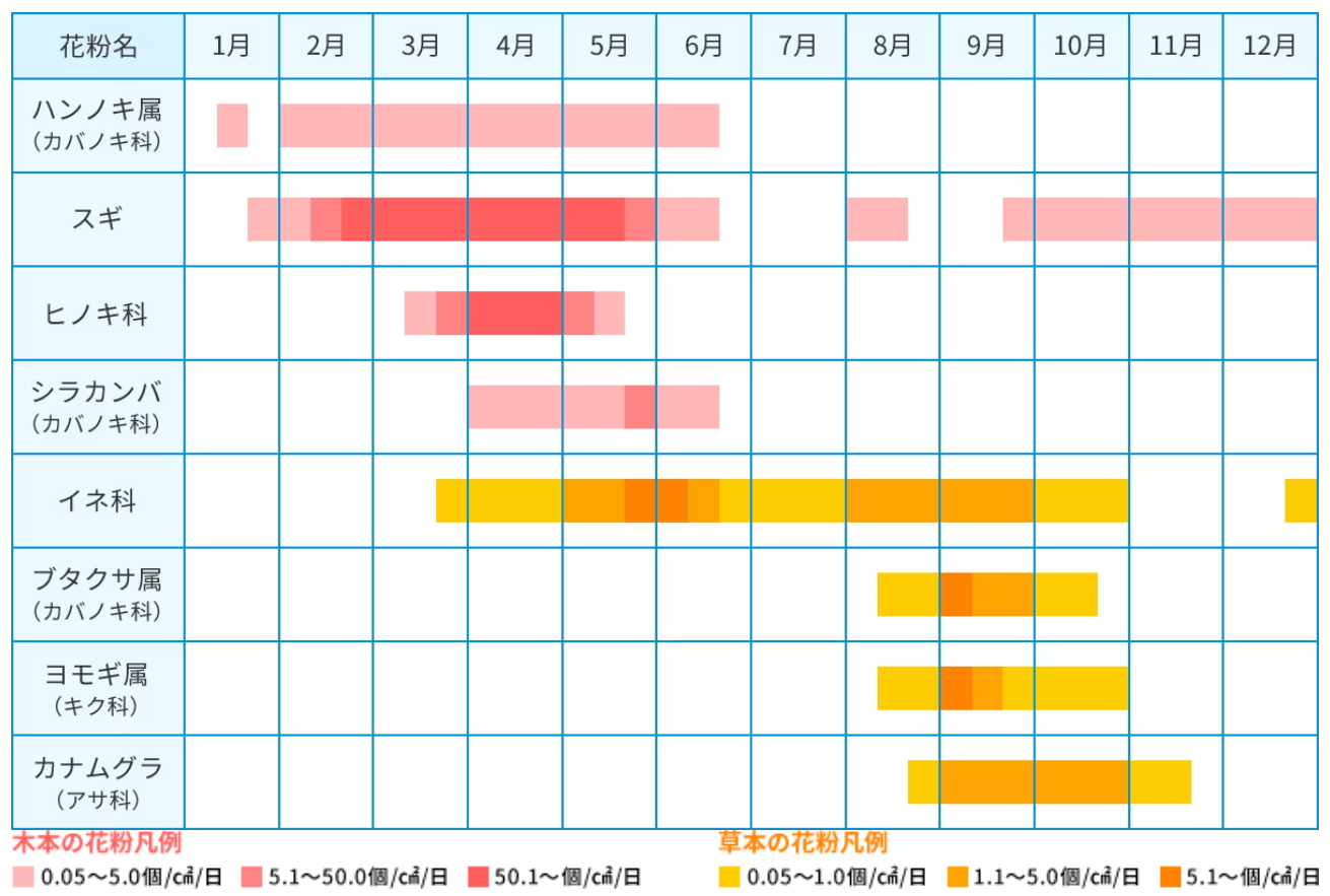特定の季節にだけ症状が出るタイプで、春はスギやヒノキ、夏はイネ科、秋はブタクサやヨモギなどが原因となります。花粉カレンダーを確認すると、症状の出やすい時期を予測できます。